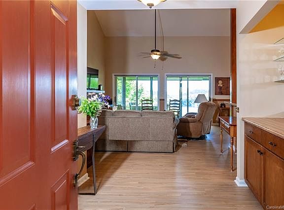 Spectacular lake & mountain views in this unique mountain retreat. Soaring ceilings, walls of windows & open flowing one-story floor plan bring far reaching vistas. Screen porch & open deck span entire lakeside of home offering a perfect place to relax & take in the beauty of NC mountains & sparkling Lake Ticoa. Fireplace w/gas logs punctuate a dramatic 20-foot-high wall & brings cozy ambiance on a cool night. The open kitchen, w/its stainless-steel appliances, is perfect whether you like to cook, or just want to show off the fabulous workspace. Two lake-facing split master suites lets you entertain overnight guests, while everyone enjoys their own space & privacy. Kitchen w/abundant storage, the super-size closets, & in the private storage room on the lower level of the building is a few of the features. Dramatic wooden beams & rich wooden accents, while new vinyl plank floors throughout & fresh paint assure you move in condition. Buyer pd CFPOA Fee $8K clg or $10K same clg yr.