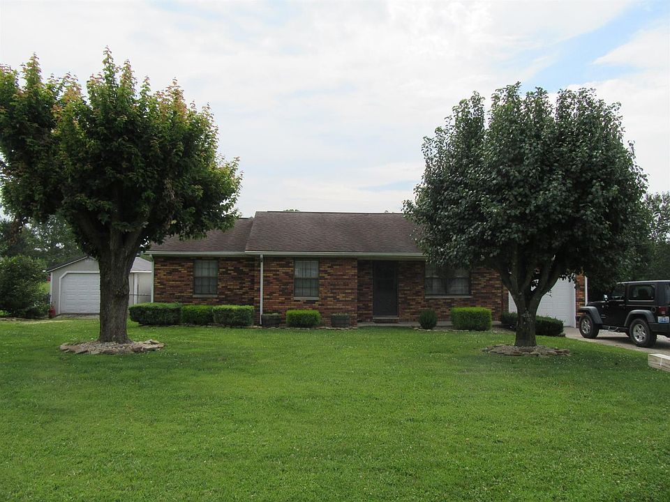 If you are looking for a one level brick home in a great location come take a look at this one! The living room is open to the dining room which has french doors to the screened in porch and back deck. Some other features you may love: hardwood floors, built in storage for electronics and guns, a nice yard completely fenced in the back, a large building outfitted for workshop and storage, and a large concrete drive with gravel extension for extra parking or an extra carport. All this only 3 miles from I75 exit 38.