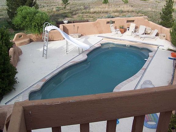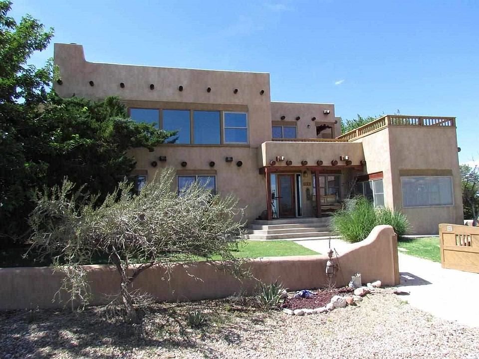 Southwestern style executive home on 20ac. bordering NM State land; Fabulous views in all directions; In-ground pool with slide; Wood double pane Hurd windows; Italian tile; Gourmet style kitchen w/double oven; 3 Kiva style fireplaces; 4 separate heat/cool units for better efficiency; Wet bar; New paint. Large covered patio for entertaining; Roof has BAC Lifetime Warranty per owner. Room to have horses. Call LA for additional information. Mescal Rd. is private road owned by the individual property owners.