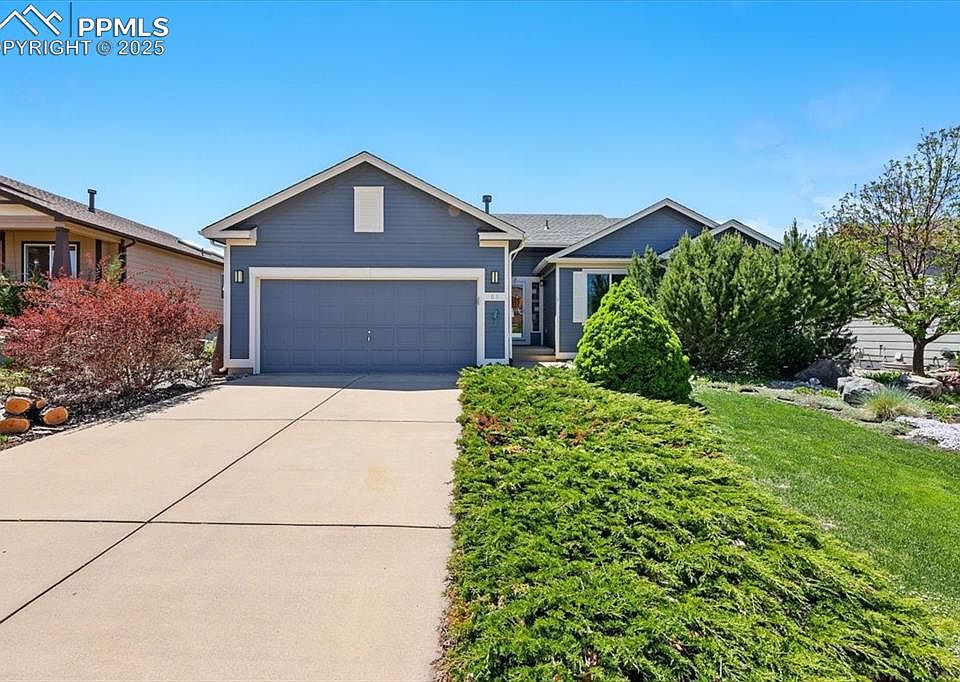 Charming Ranch Home | No HOA | Pikes Peak Views & Garden Retreat! This beautifully maintained ranch-style home offers peaceful living in an HOA-free community with stunning Pikes Peak views. The backyard is a true sanctuary, featuring English gardens, a tranquil fish pond, an ivy-wrapped pergola on the patio, and even a charming chicken coop at the back of the property. Inside, the vaulted living room welcomes you with wood floors, a ceiling fan, and a gas fireplace with classic brick surround. The bright kitchen includes a dining area, tile flooring, pantry, stainless steel fridge, dishwasher, and microwave, along with the self-cleaning oven and direct access to the outdoor oasis. The main level Primary Suite features wood-look tile, vaulted ceiling with fan, a cedar-lined walk-in closet, and en-suite with shower. Two additional bedrooms on the main level share a full bath and also have wood-look tile. The laundry closet is conveniently located on this level. The finished basement offers a spacious family room with stained concrete floors and built-ins. Two more bedrooms downstairs include built-ins and large closets, sharing another full bathroom. Built-in speakers are featured in multiple areas of the home. A 2-car attached garage adds convenience and storage. This unique property is perfect for those who value charm, nature, and freedom - without the constraints of an HOA!