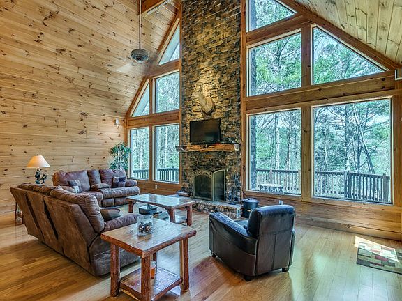 Spacious 5BR/4BA in the beautiful community of Buckhorn Estates located between Ellijay & Blue Ridge. Home features a huge wall of windows surrounding the floor-to-ceiling stacked stone wood burning fireplace. Hardwood floors & channel groove pine throughout the main & upper levels. Fully equipped kitchen w/porcelain tiled counters & room for dining. 2 TRUE masters including one on main. Laundry & 1/2 BA also on main. Claw tub w/shower in mstr ba upstairs & a huge full finished basement w/3BR, family room & full BA round out the interior. Plentiful decks to enjoy seasonal MTN view. This is a home that proves you can't judge a book by it's cover, the home looks small from the outside, yet has 2928 square feet of living area! Furnishings are negotiable, seller will consider selling it turn key. Low POA fee of $175 per year. 09/30/16