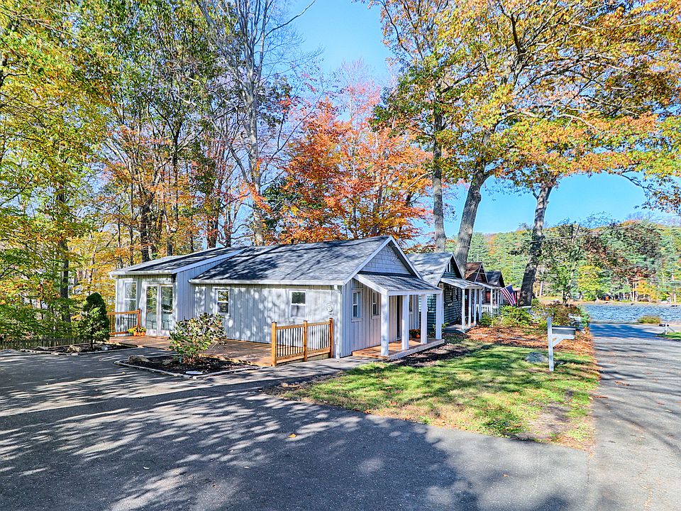 Good things come in small packages and this little gem sparkles! Total renovation of this peerless Pinewood Lake cottage completed in 2020 with new roof, Alder wood doors, board & batten cedar siding, cedar decks, outdoor shower, LVT plank flooring, kitchen, bath, high efficiency HVAC, windows/sliders and on-trend fixtures and finishes. Excellent use of space and open plan layout features living room/dining area with vaulted ceiling with sliders to deck with stairs leading to large, partially fenced backyard with lake views and outdoor shower. The chef's kitchen boasts a breakfast bar with great storage, white maple Shaker style cabinets, quartz counters, glass tile backsplash, LG stainless appliances including 5 burner gas range. Located off the kitchen are sliding glass doors to a deck to enjoy lake views with your morning coffee or evening cocktail. A sleek gray and white bath features an oversized ceramic subway tiled shower, next level vanity and black iron fixtures. Sunny bedroom has multiple windows, closet & cedar storage with barn door. The foyer can double as a home office and stackable washer/dryer is tucked neatly behind a barn door. Cottages here are rarely available and this one is the finest at the lake with oversized paved driveway and large lot. Home conveys with private deeded beach rights. Pinewood Lake Association membership optional. See addendum. Convenient location near town pool, parks, hike/bike trails, shopping & transportation;68 miles from NYC.