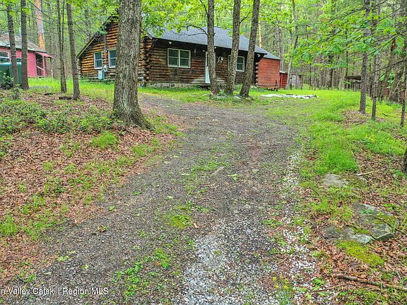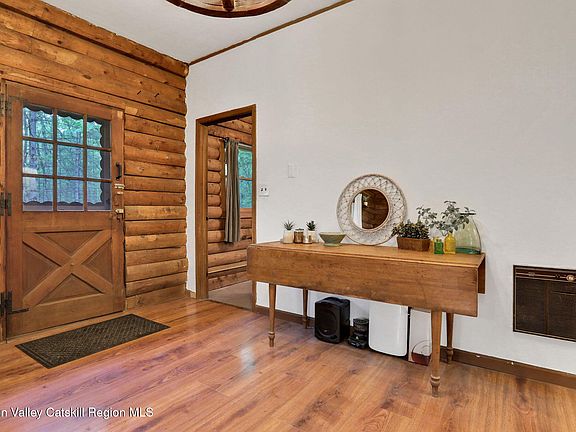 Tucked into 6.5 wooded acres on a quiet road in Kerhonkson, this 2-bedroom, 1-bath cabin with an additional room currently used as a 3rd bedroom (or could be a dining room or office), is full of rustic character, creative spaces, and hidden gems—like your very own tiny treehouse waiting down the trail. At 900 sq ft, the log cabin feels cozy yet open, with warm wood walls, a classic wood stove against a brick hearth, and natural light flowing through each room. The kitchen is spacious and functional, with room for upgrades or a nostalgic embrace of its vintage style.