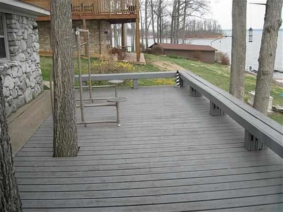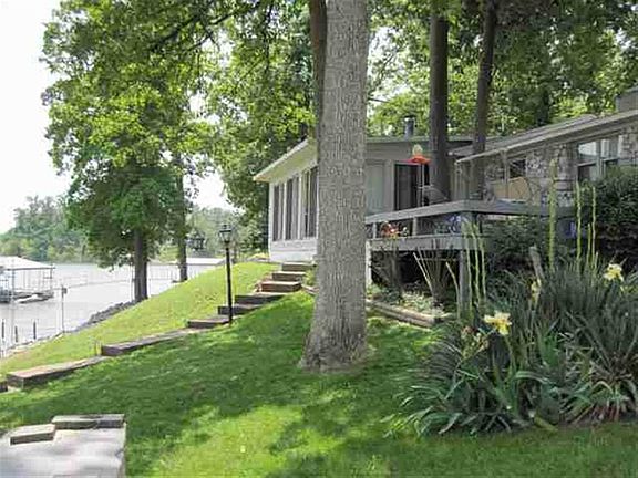 Million Dollar View of Kentucky Lake!!! Cozy waterfront home with 3 bedrooms- 2 full baths- central H/C- great room has vaulted ceiling and a large stone fireplace- glassed in sunroom- back deck- private dock- 2 rail systems- paved circle drive- detached garage- 2 car carport- storage building- BBQ pit- and a 12 x 12 gazebo. Fabulous views on the main- Very close, gentle slope to the waters edge- 122 ft. of TVA contour. Reduced $399,000.
