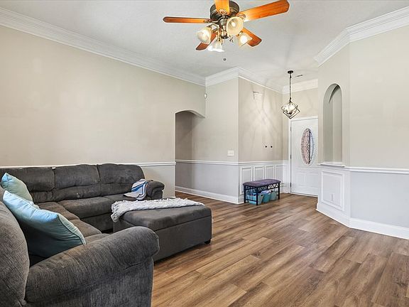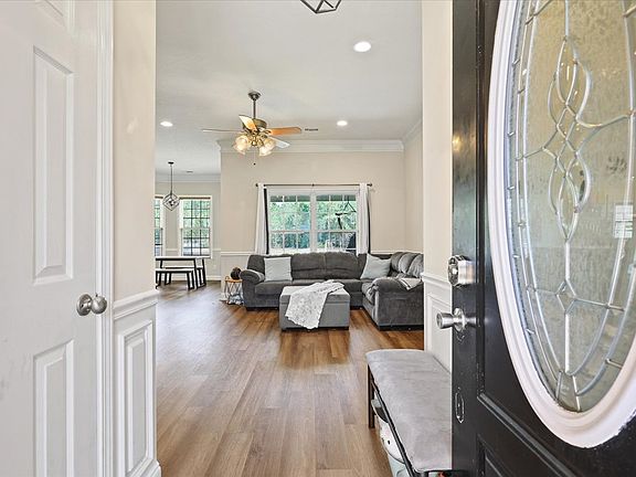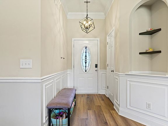 Step inside this rare beautifully updated retreat on over 1+ Acre!! Tucked back by the large culdesac, this full brick head to toe w/ gutters throughout is move in ready. The grand foyer welcomes you with vaulted ceilings, wainscoting, and endless natural light. The open floorplan allows you to gaze over the fresh new paint past bay windows over to the large kitchen with new stainless steel appliances. Updated chandeliers, sink, faucets, toilets, light fixtures, you name it. Spacious laundry room, double tray ceilings for the grand primary ensuite with his and hers sinks, walk in closets, soaking tub and separate walk in shower. Down the hall you have the second full tub/shower to share between the other two spacious bedrooms. Work your way outside to the covered back patio and enjoy the endless possibility in the backyard with private treeline. Don't miss the opportunity to call this home!