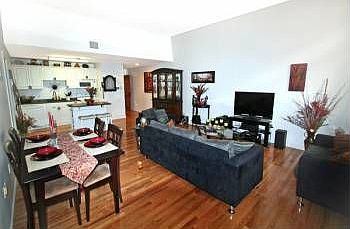 Spacious kitchen/living/dining with sparkling hardwood floors and oversized windows overlooking rear courtyard!