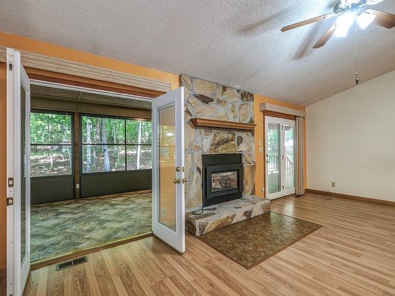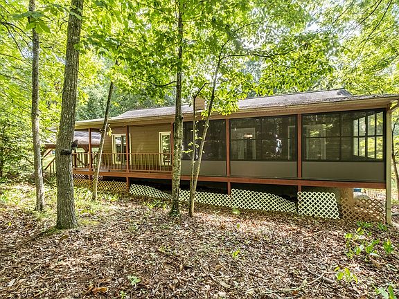This cute 2-bed, 2-bath single-level home in Blairsville GA offers the perfect blend of comfort and potential! On a level yard with fruit trees, established flower and shrub beds, and a gravel driveway leading to your carport, this home exudes warmth and character. As you approach, a set of stairs invites you onto the welcoming front porch and deck. The large partially screened back porch provides space for relaxing and enjoying the outdoors. Inside, the spacious Great Room has a vaulted ceiling and a stone gas log fireplace, creating a cozy yet grand atmosphere. Flanked by double glass doors that open onto the screened porch, this room is perfect for entertaining or quiet evenings at home. The open kitchen features an island and ample counter space. Adjacent to the kitchen is the master suite, with bathroom, walk-in closet, and double glass doors leading to the screened porch. For added privacy, the split design places the guest bedroom and bathroom across the Great Room, along with the laundry room. The guest bedroom is perfect for visitors, while the guest bathroom is both stylish and functional. A set of stairs in the hall leads to the full unfinished basement, offering endless possibilities for storage, a workshop, future living space, and includes a garage door for easy access and convenience. Whether you're relaxing on the screened porch, gardening in the yard, or envisioning the potential of the unfinished basement, this property is ready to welcome you home. Estate Sale being sold as-is with no representations.