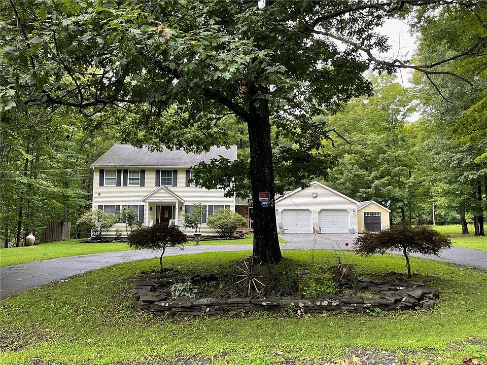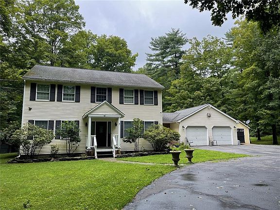Exquisite Colonial Home on 2.5 beautifully landscaped acres. A Welcoming circular drive leads you to this semi-secluded retreat, where elegance meets modern convenience. This spacious home features four bedrooms and three full baths, including a luxurious master suite with an en-suite bath and relaxing whirlpool tub. Gleaming hardwood floors throughout and a modern eat-in kitchen with a large pantry, perfect for any culinary enthusiast. Entertain in the formal dining room or unwind in the inviting living room, complete with a classic brick fireplace. Step through the breezeway to your private lap pool, or head to the heated two-car garage. Upstairs, you'll find a cozy reading nook along with the four bedrooms. Enjoy the outdoors on the spacious bluestone patio or gather around the fire pit for a peaceful evening under the stars. This home also includes a wood-burning furnace, ideal for supplementing heat during colder months and a whole-house generator for added peace of mind. Additional Information: HeatingFuel:Oil Above Ground,ParkingFeatures:2 Car Attached,