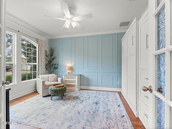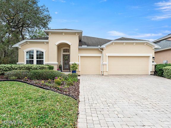 Incredible opportunity to own 61 Taylor Ridge Avenue in Ponte Vedra, Florida! This beautiful 4 Bedroom, 3 Full bathroom, office and dining/flex space home with a true three car garage AND mature, shrubs/trees on a larger lot is spacious and all on one level. Walk in and notice the steps leading up to the decorative ornate glass front door, nice foyer, Office with French glass doors as well as a built in Murphy bed for functionality. Separate dining room with built in cabinets for extra storage & custom wallpaper make this space perfect for entertaining. The kitchen has a huge center island, lots of cabinets with pulls, and is open to the family room for great functionality. The kitchen has lots of countertop space, gourmet kitchen appliances as well as an eat in area. Double sliders to the screen lanai from the family room allow for indoor outdoor entertainment. Primary bedroom has views of the mature shrubs & trees make this lot very private. Three additional bedrooms and two full bathrooms are separated with their own entryway. Two bedrooms share one full bathroom and another bedroom has it's own bathroom and could be made into an in-law suite. The three car garage with garage door opener allows for plenty of storage and parking. The backyard has mature trees and shrubs making it private. Newer HVAC (2021), NEW refrigerator (2025) and dishwasher (2023). Tile floor and LVP flooring in the secondary bedrooms & area. This 2686 sq ft home in Greenleaf Village is a very short walk to the local neighborhood park, convenient proximity to Valley Ridge Academy (K-8) in St Johns County. Two parks are in the Greenleaf Village community. Greenleaf Village is located close to the new Publix at Nocatee as well as an easy drive to the Nocatee Town Center. Conveniently located for easy access to 210 and US Hwy 1. Part of the Nocatee Community and access to all of Nocatee's amenities and events!