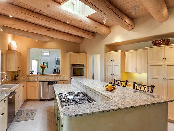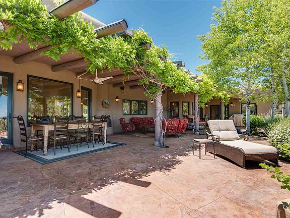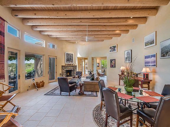 Peace and tranquility abound in this single-level, 4 bedroom, 4 bath Las Campanas custom beauty. Bring the outdoors in with 3 separate portals, 2 fireplaces and an upstairs viewing deck. The home sits on almost 2 acres of land overlooking a nature trail and an abundance of protected greenbelt creating a sanctuary for birds of all varieties. A stunning living room with a river rock fireplace and a wall of windows provides unparalleled views. The master suite of rooms opens up to a private patio with hot tub and a second master suite sits at the opposite end of the home doubling as a media room or art studio. Two additional bedrooms enjoy their own private space and four additional fireplaces create unrivaled intimacy throughout. Conveniently located close to the Club, Spa and Equestrian facilities, makes this home a must see!