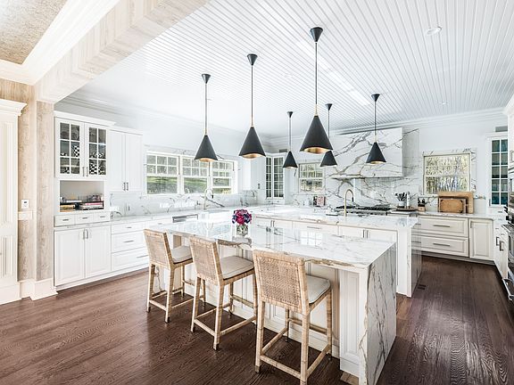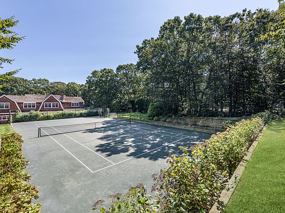 Sophisticated indoor-outdoor living awaits in this stunning Water Mill six-bedroom, seven-and-a-half-bathroom traditional Hamptons Shingle residence bordering a 47-acre agricultural reserve featuring exquisite designer interiors, extraordinary craftsmanship, and expansive, nearly 2-acre grounds with a pool and tennis court. Built-in 2006 by Keith Seigerman with interiors by Ken Alpert, this over 7,500 +/- total-square-foot showplace creates a comfortably grand ambiance with soaring ceilings, four-inch oak flooring, intricate millwork, and Lefroy Brooks fixtures throughout. From the impressive double-height entry, you're invited into formal living and dining rooms boasting tall wainscoting, coffered ceilings, and a wood-burning fireplace. The sprawling, eat-in kitchen awaits your culinary skill with custom cabinetry, double islands, and a fleet of Viking stainless steel appliances. With its fireplace and built-in wet bar, the oversized family room is sure to become a favorite gathering spot. An extra-large main-level bedroom suite completes the first floor. Outside, the large covered porch is perfect for al fresco dining and entertaining alongside the herringbone brick patio, covered porch, and a summer kitchen with a built-in Wolf grill and refrigerator. Lush lawns, stacked stone walls, and terraced planter beds surround the 18-foot by 36-foot heated gunite pool and spa. Above, the Har-Tru HydroCourt tennis court awaits your next match. This serene 1.9-acre property borders a 47-acre agricultural reserve and also includes a state-of-the-art playground, landscape irrigation, and professional lighting by Orsman Design. Ascend the central staircase or board your private elevator to arrive on the upper level, where the magnificent owner's suite boasts an enormous windowed walk-in closet and a private balcony overlooking the lush grounds. The en suite spa bathroom beckons with radiant heat floors, a wide double vanity with knee space, jetted soaking tub, and a huge walk-in shower for two. Four more bedroom suites with private baths on this level, plus two bonus rooms on the lower level, provide luxurious accommodations for friends and family. On the finished, walk-out lower level, enjoy a movie theater, additional bonus rooms, wine room, and a large rec room with space for a home gym. This home's extensive upgrades include a video security system, integrated Sonos sound, and eight-zone climate control with forced air heat. A wide driveway and three-car attached garage with an EV charger provide plenty of parking, while the cedar shingle siding and roof add classic good looks to this handsome Hamptons hideaway. In this wonderful Water Mill location, you're under two hours to NYC, surrounded by bucolic farmland with easy access to Montauk Highway and nearby beaches, including Flying Point Beach, just over 3 miles away.