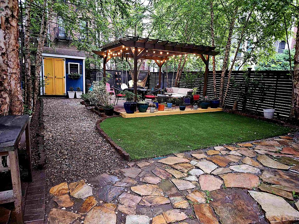 Welcome to this stylish 2-bedroom condo located on a quaint, tree-lined street in the heart of Downtown Jersey City just a 3 minute walk to the PATH and Citibike stations, Van Vorst Park and the Grove St. Pedestrian Plaza - where the Jersey City nightlife thrives. This thoughtfully designed home features two spacious bedrooms, a fully equipped kitchen, and a large open-concept living and dining area that blends historic charm with modern comfort. A bonus flex space offers the perfect spot for a breakfast nook, home office, or creative corner. Exposed brick details, polished concrete floors with radiant heat, and convenient in-unit laundry complete the interior. Step outside to your 1400sq foot exclusive backyard your own private, hidden escape from the city. Designed for both relaxation and entertaining, it boasts a custom Ipe Brazilian wood deck, a stunning pergola, a shed for extra storage, and ample space to lounge, dine, or garden. All this just moments from restaurants, shops, parks, and everything downtown has to offer.