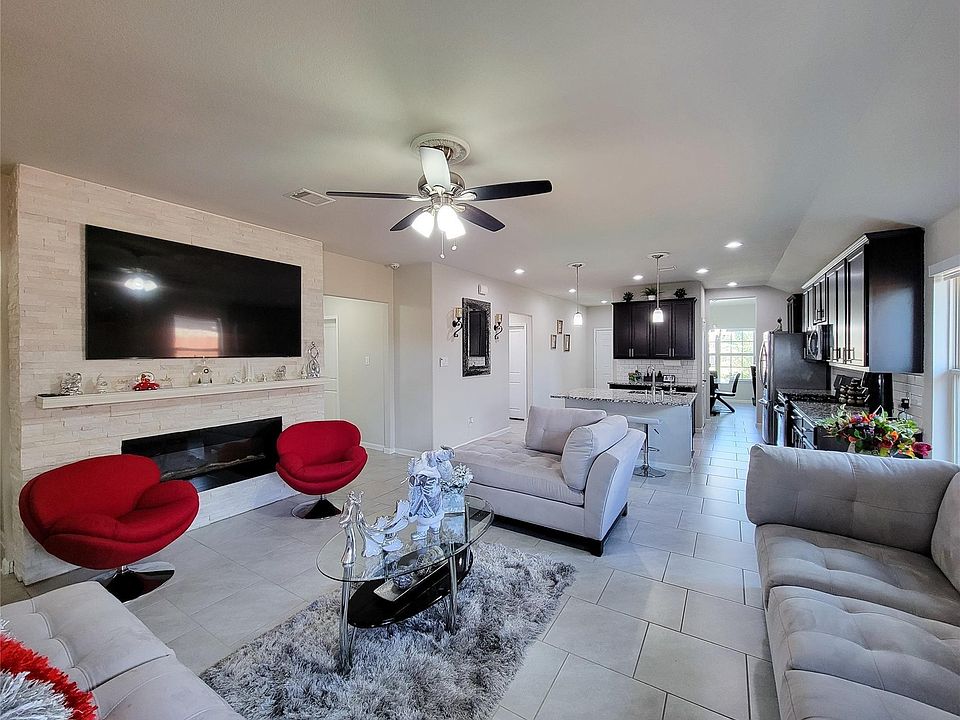 Welcome Home! This 3 bed 2 bath home features a beautiful stone decorative wall & mock fireplace in living room, extended patio slab, huge primary bath & walk in closets, open concept perfect for entertaining. This resale feels like new ! Immaculately maintained interior & exterior. Great location towards back of the community for extra privacy. CALL FOR YOUR appointment today. Hablamos espanol.