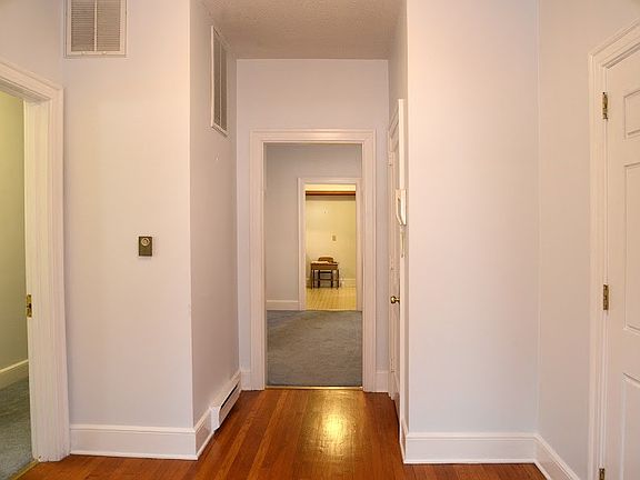 Original hardwoods. In 2016, new tile or vinyl in updated baths & kitchen.Appliances remain. Quartz kitchen counters, granite en-suite Mbath. 1st floor. Foyer, living room, dining room, kitchen, laundry. Wide hallway.Guest BR next to guest bath at opposite end of MBR for privacy. New HVAC 2016. A spacious,light-filled 1275 sq ft. 2 assigned parking spots.