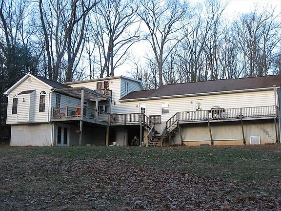 PRICE REDUCED!! Peaceful and private setting on almost 3 acres! Unique home with a huge family room expansion with stone fireplace. Relax on your deck, overlooking a level, private rear yard backing to trees and a stream, with a bonfire area with raspberry bushes. Scenic walking trails for you & your pets. The upper level has a huge master suite with a full bath, walk-in closet and sitting area, and an artist's loft with its own balcony. The walkout lower level is unfinished, but has a rough-in bath, and is plumbed for a 2nd kitchen. The detached workshop has water and electric, and is perfect for a small business owner.