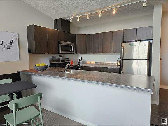 FIRST TIME OR INVESTOR ALERT! Affordable ownership with this TOP floor unit featuring 1 bedroom and 1 4-piece bath (not a studio), a well-designed spacious kitchen with stainless steel appliances and modern cabinetry, bright living space with vaulted ceiling and ample light coming through large east facing window and patio door - leading to private balcony with views of the neighboring trees. Open the sliding doors to primary bedroom with walk through closet and 4 piece bath that also can be accessed to by the living space. In-suite laundry! Amenities in The Nest include meeting room, exercise room, guest suite and building designed with accessibility in mind.