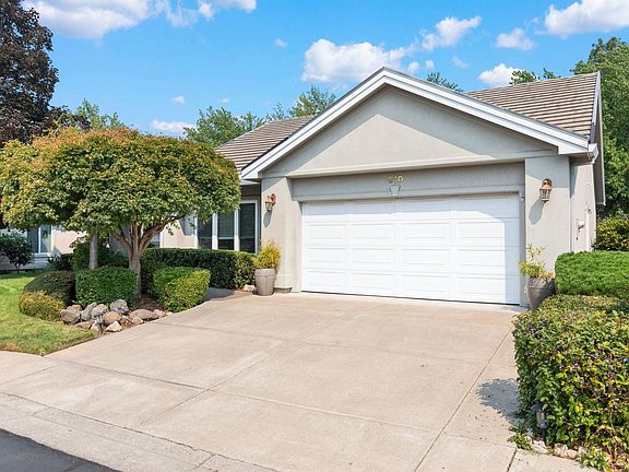 Pride of ownership shows inside and out on this lovely 2 Bdr, 2 Bath home located in the finest Gated community of Alder Creek! Located at the end of a quiet cul-de-sac with views of mature trees and lovingly tended roses & hydrangeas to enjoy off your Covered Patio! As you enter the home, the foyer opens to the expansive Living Room and Dining Room with Vaulted Ceilings giving a very spacious feel. The gas fireplace and mantel complete the coziness of this home. Large kitchen with New Stainless Refrigerator and Sink, lots of counter space and cabinets. New wood-look vinyl plank flooring throughout. Large windows create an abundance of natural light. Spacious Primary Bedroom with nicely updated Bathroom en suite, including, skylight, new vanities with granite countertops, easy-step shower & upgraded lighting! Fresh Interior Paint! The HOA covers all landscaping creating a pristine neighborhood and easy-living yard. Conveniently located near shopping, medical and golf!