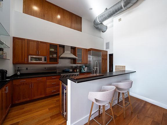 Loft Life. Exceptional 1794 sq. ft. quiet penthouse condo in The Cast Iron featuring a keyed elevator that opens directly into your home, large private terrace, 15' ceilings, oversized primary bedroom, two upper floor lofted bedroom/office spaces, two baths and deeded garage parking. Unique of its kind, #4W at 610 Clinton St. offers a truly urban chic lifestyle; ultra-modern in essence with an open floor plan, floor to ceiling windows and exposed ductwork all set in a warm backdrop of exposed brick, iron staircase and cherry hardwood floors. Large chef's kitchen with honed black granite counters, cherry cabinetry, Viking 6 burner gas range, Sub-Zero refrigerator, Bosch DW and wine cooler. The primary bedroom has a his & her walk through closet leading to the en suite bath. The en suite bath includes a frameless European walk-in shower, separate soaking tub, double vanity and mosaic glass tile. The second bathroom features full tile, Restoration Hardware vanity and granite trough sink. Separate laundry room with full size washer/vented dryer and built-in storage. The upper floor lofted bedroom/office spaces may be opened to views of the entire loft by removing the custom-built panels from the wall in one (above the kitchen), and/or by opening the sliding privacy doors in the other. The Cast Iron is a small boutique building with only 14 residences in the heart of Hoboken. Close to everything in the city: Bus, PATH, train, restaurants, parks & shopping. One deeded assigned parking spot included (Northeast corner of the garage). Second deeded parking spot also available for purchase nearby.