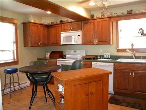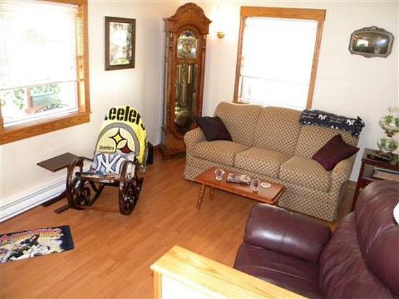 This 2 Bdrm, 1.5 bath home has been totally renovated inside & out. Delightful oak kitchen complete w/ appliances, formal dining room, living room, solid oak trim throughout, 1st floor laundry, tilt windows,cov'd front porch, unfinished heated basement...outside you'll find a large heated garage complete with man workshop and finished game room/man cave for your entertainment. Home is situated on large in town lot.
