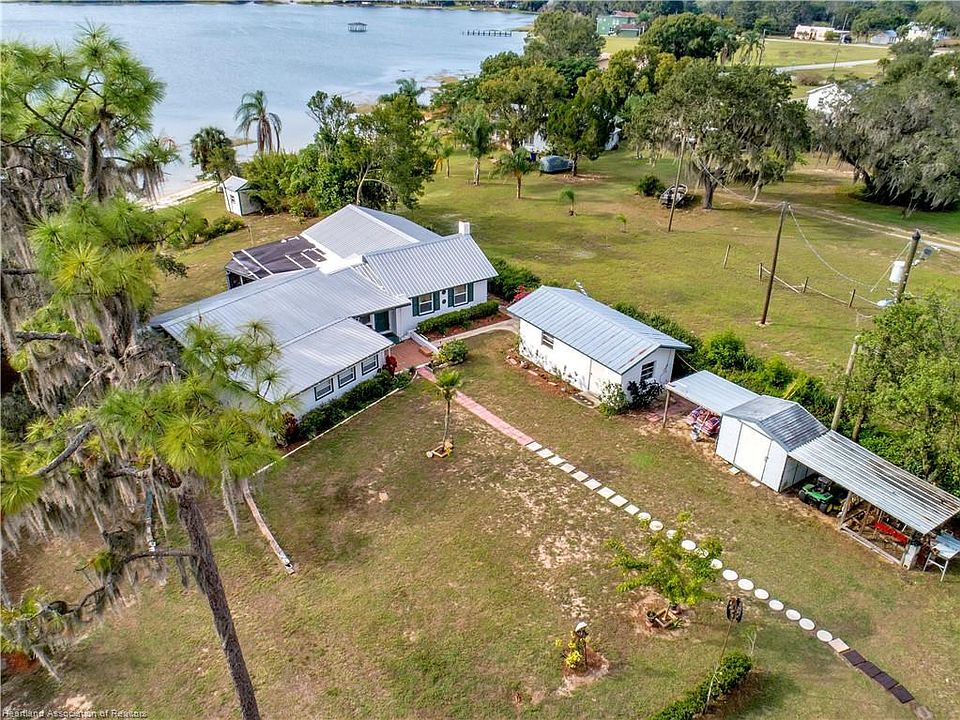 You will not be disappointed! Lovely 3 bedroom 3 bath Lake Lotela property. This property offers .95 acres with 100 ft of white sandy beach. As you enter you will be mesmerized by the vaulted and beamed tongue and groove ceilings and the large picturesque windows overlooking the lake. Huge living room with fireplace and large tile throughout the home, The kitchen has updated solid surface counters and newer applicances. The views from the kitchen and dining areas are stunning. Who would not want to wake up everyday in this lake front paradise.Kitchen has door to lanai which leads out to the beach or onto a wooden deck with grilling area. The bedrooms are generous size and 2 have large windows out to the lake. This property has a she shed, a he shed, and a boathouse. 20 x 40 pole barn with concrete slab that fits a travel trailer. Call for your appointment today!