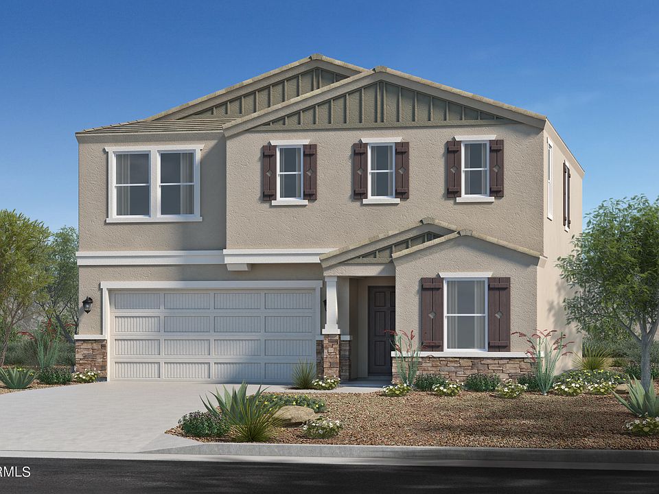 This lovely two-story home features an 8-ft. entry door and SmartKey® front door hardware. The open concept floor plan includes a spacious great room with a sliding door that leads to a covered back patio. The great room overlooks a modern kitchen with a center island, granite countertops and Whirlpool® appliances. Youll also find a private den. Moving upstairs, a spacious loft is perfect for entertaining. The primary suite offers a walk-in closet, and the luxurious walk-in shower,and a dual-sink vanity. This community offers a playground and walking trails.