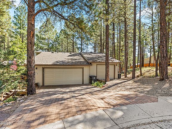 Quintessential Flagstaff Home in sought after Bennett Estates! Nestled in the pines, this MOVE-IN ready, SINGLE LEVEL 3BR, 2.5 Bath home is a gem. Located on a quiet cul-de-sac enjoy the outdoors on the inviting front deck or shaded open paver patio. Inside, spend your time enjoying the beautifully remodeled kitchen that boasts hickory cabinets and new appliances, a welcoming fireplace in the living room, and a spacious primary bedroom with wood floors, vaulted ceilings, and its own cozy fireplace. For the hobbyist, the insulated and heated 1-bay garage with 220V hookup is a perfect WORKSHOP. Don't miss this opportunity to own a wonderful home in Bennett Estates!