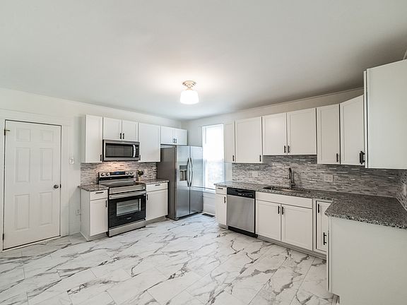 Beautifully renovated kitchen with granite countertops, stainless steel appliances, tiled backsplash, and soft-close cabinets