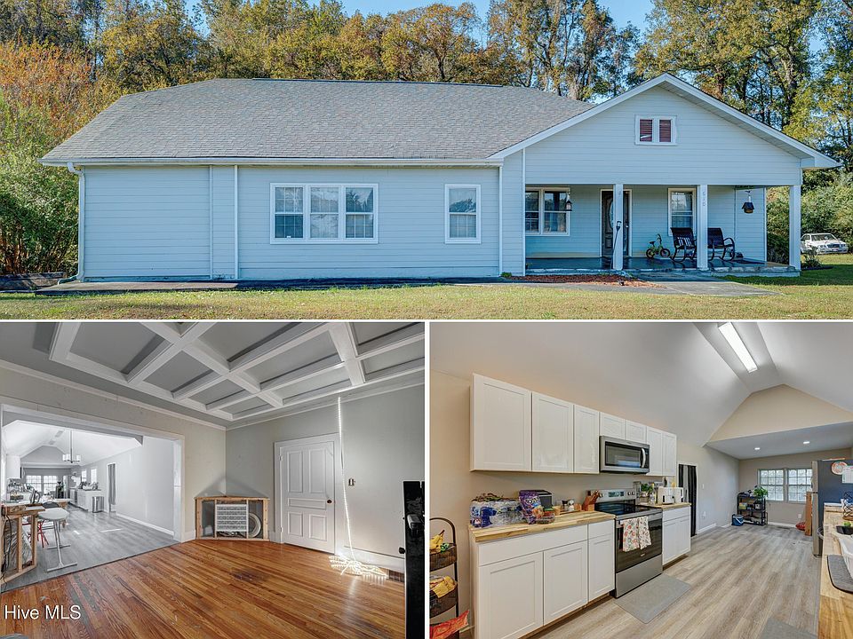 Welcome to this 1925-era Southern classic brimming with potential and your finishing vision. Set on a spacious 0.91-acre lot, with just over 3,000 sq ft, this home has been partially renovated and is ready for you to complete it and make it your own. Inside, you'll find a blend of original hardwood floors and new LVP flooring, a wood burning fireplace and updated bathrooms. The remodeled kitchen with newer stainless steel appliances and a vaulted ceiling brings a fresh and functional centerpiece to the home. The large primary bedroom has an on-suite tiled bath with a step-in shower and jetted tub. Two separate entrances and living areas offer flexibility for dual living arrangements—ideal for multi generational living or even the possibility of converting into a duplex with a shared or an additional second kitchen. The sun room at the rear of the home is already plumbed for a future kitchen and the attached office could be a large pantry. An unfinished attic provides additional space for expansion or storage. Enjoy peaceful country living with room to garden, entertain, or relax on the front porch