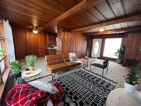 Take a look at this home located on a corner lot with two entrances to the property. Nice drive through from the front and side of the home. The interior details like the beam ceiling, kitchen cabinets, and wood slat dividers reminiscent of a midcentury vibe along with the large windows in the living room that bring in a lot of natural light. The original cast iron sink with a drain board is a nice vintage touch, while the new faucet and HVAC system offer modern upgrades. With the option for a third nonconforming bedroom or extra living space, there's some versatility for the new owners. It has a freshly painted exterior, some new landscaping, there is a nice size firepit area in the back yard for entertaining and new exterior lighting on the front and side of the home. You can make this your new home or a Great investment property. The home has been a rental property for the last 20+ years. And has only been vacant the last monthit has served well as a rental property for the seller.Storage shed will stay with the property .