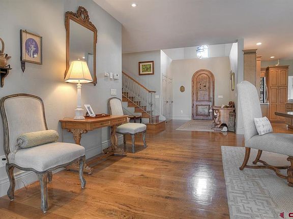 Looking for a beautiful, quality home in the Animas Valley with views? Then look no further. This gorgeous, custom home is located on one of the premiere lots, on the 5th hole at Dalton Ranch and boasts a "French" architectural influence. This single-owner beauty has been meticulously cared for and pride of ownership shows. This gem offers 3038 square feet, 3 bedrooms, 3 1/2 baths (3 baths ensuite) plus an office and two patios. As you walk in the front door you enter a magnificent great room and dining area with real hardwood flooring. This home is an entertainer's dream. The large sunken living room, complete with wood burning fireplace and back patio access and wonderful natural light, will have you feeling you are on vacation in your own home. Your guests will always feel included with the open floor plan. The large kitchen with quartzite natural stone counters, center island, stainless appliances, and large built-in bar will bring out the gourmand in you! Adjacent to the kitchen is a charming office, with an octagonal window and pocket door. The primary bedroom is located on the main level with a private patio and it is accompanied by a bath adorned with travertine tile flooring, a shower, and a separate jetted bathtub. Upstairs you will find two more generously sized bedrooms and ensuite bathrooms as well as a sitting area and craft area. The home has a 50 year roof, solar panels and is extremely energy efficient, with an Energy Star rating. Sellers would like to close this year but rent back until May 31, 2024. Don't buy anything in this price range without seeing this home first! LPEA: $27 avg, $30 Hi, $24 Lo over last 12 months Atmos low $30 and high $275 in Dec/Jan) (other months $61m $52m $70)