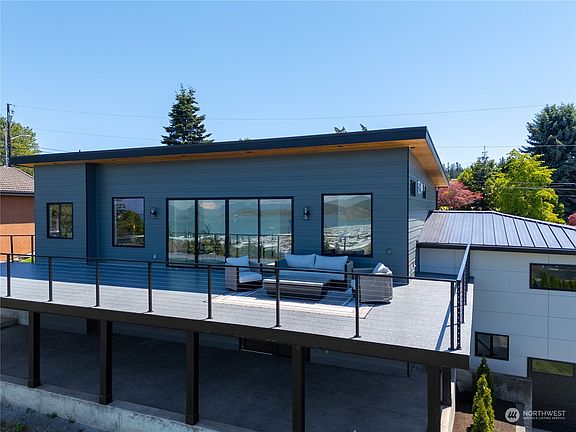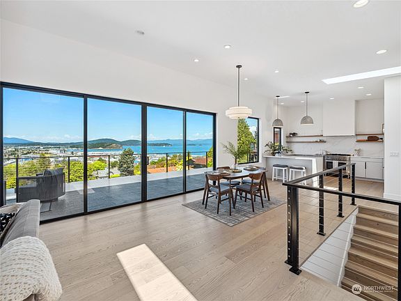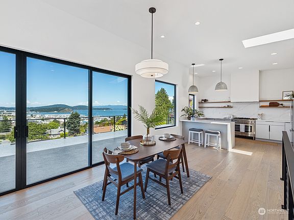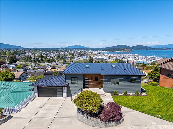 Enjoy prime in-town living and unmatched water views of Fidalgo Bay, Cap Sante Marina, and downtown Anacortes! This remarkable home features a 1,000 sq ft deck for indoor-outdoor living, panoramic windows, vaulted ceilings, on a dead end road. The beautiful ensuite boasts exquisite finishes, creating a spa-like sanctuary and the primary closet includes a washer/dryer for convenient single-story living. Downstairs, you'll find a secondary kitchenette and a covered patio for year-round entertainment. The oversized lot offers space for a potential shop or ADU. Don't miss the large workshop with backyard access, perfect for any hobby or project! Truly rare to find a fully renovated home, located in town, with water views, on a large lot!