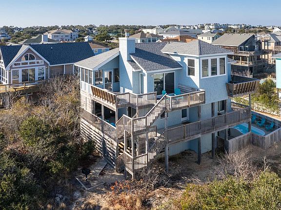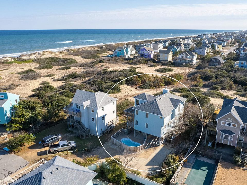 'A Salty Piece of Land' awaits you in Ocean Sands, boasting breathtaking unobstructed OCEAN views! This charming cottage backs up to open space in section E of Ocean Sands giving you the most stunning panoramic water views. Located just 100 yards to the beach access, it offers the ultimate Outer Banks retreat. Ample sun and covered decking look out over the Ocean, and you will love the private 13x18 pool area for unwinding after a long day at the beach. You can look for dolphins from the ship's watch, dine outside on the screened in porch, or cozy up by the wood burning fireplace. The reverse floor plan maximizes your views, and the kitchen, living and dining area offer a comfortable open floor plan to make entertaining a breeze. The top level also features a Queen primary bedroom with a private en-suite bath, and a powder room off the living area. The 1st level offers 3 additional bedrooms, including another Queen primary with private en-suite bath, a Bunk Room and a Twin Bedroom that share a full hall bath, a Laundry Room, and access to the hot tub on the mid level covered deck. The ground level provides dry entry and access to the carport and pool area, outside shower, and outdoor grill. Ocean Sands is a oceanside community that offers natural wooded areas and expansive uncrowded beaches. It is just a few miles from the heart of Corolla on the Oceanside, so you are also close to shopping, restaurants, coffee shops, and entertainment! Recent property improvements include: NEW Windows in Ships' Watch '23; NEW interior paint in Kitchen, top level primary BR, Twin BR, Powder Room, and mid level hallway '23; NEW Exterior paint '22; NEW interior paint mid level primary BR, Bunk BR, mid level full bath '22; NEW Hot Tub '22; NEW exterior trim paint '21; some NEW deck work '21; NEW mid level primary BA shower '21; NEW refrigerator '21. Ocean Views like this are hard to find on the Outer Banks, so don't let this opportunity pass you by!
