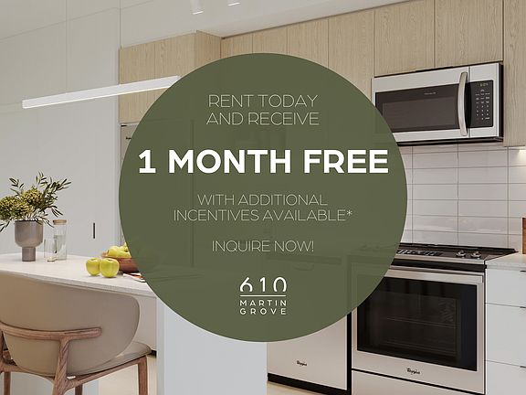 Select suites only. Terms and conditions apply. Prices and specifications subject to change without notice. E&OE.Now leasing at 610 Martin Grove stylish, brand new apartments in Etobicoke!Step into a refreshed lifestyle with our one-bedroom, one-plus-den, two-bedroom, and two-plus-den suites, thoughtfully designed for modern living.Suite Features:Open-concept layouts with luxury vinyl flooring and expansive windowsQuartz countertops and ceramic backsplashKitchen island and four stainless steel appliancesConvenient in-suite laundryPrivate balcony with scenic views (select suites only)Roller blinds and blackout bedroom blindsCentral A/C for year-round comfortPremium Amenities:State-of-the-art fitness centreResident lounge and party room with full kitchenMultiple coworking spaces and Zoom roomsPet spaCommunity garden & outdoor grilling stationsSecure parcel roomUnderground and visitor parkingCommunauto car share on-siteSmoke-free building with secure fob accessNestled in the vibrant Richview, Etobicoke neighbourhood, you'll enjoy easy access to parks, walking trails, local shops, transit, and everyday essentials. Whether you're relocating, downsizing, or starting fresh, 610 Martin Grove offers a welcoming community and a lifestyle that fits your next chapter.Embrace the ease of connected living at 610 Martin Grove. Inquire today to be among the first to call it home!
