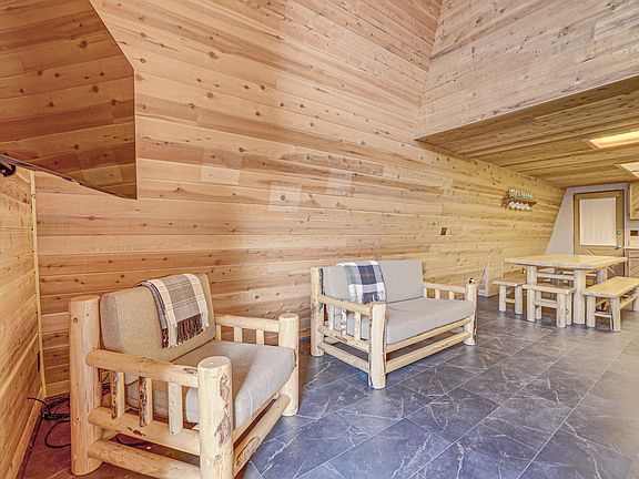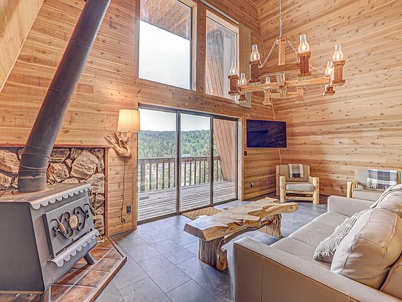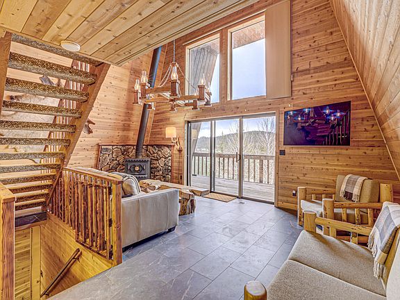 Rustic modified A frame cabin with modern conveniences, including a forced air furnace and new flooring throughout. This cabin has all the vibes you're looking for, stunning views, quiet street, great deck and patio. Main floor features double height ceilings, gorgeous rock hearth and wood burning stove. Massive window wall to take in the view. Tongue and groove details throughout. Spacious eat in kitchen and bathroom on main floor. Upper level consists of two sleeping areas. Lower level offers more sleeping space in the bonus room. Built in wood storage and deep bay garage. Furnace and water heater located here too. Pull through driveway and additional pull in parking space. Offered turnkey furnished. Swains Creek offers a peaceful cabin experience, no vacation rentals allowed.