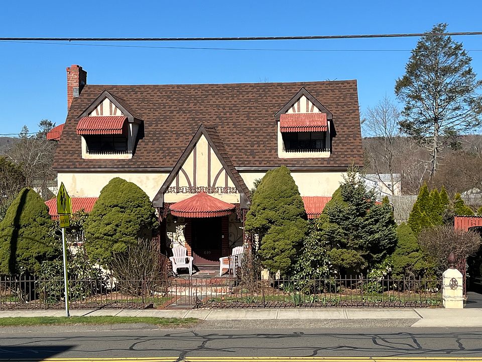 Discover this Tudor cape-style home behind a quaint iron gate, offering a unique entry experience. As you step inside through the arched doorway, you're greeted by a functional eat-in fully applianced kitchen. The grand room boasts a fireplace, providing a cozy focal point, while large windows bring in ample natural light, enhancing the space. Hardwood floors flow throughout the first and second floors, lending a classic touch to the home's ambiance. The main level includes a guest bathroom for added convenience. Ascend the hardwood stairs to find the primary bedroom with a skylight and double closet, offering comfortable living quarters. The recently updated full bathroom features a double vessel vanity, soaking tub, and shower, adding a touch of modern luxury. A second smaller bedroom on the second floor provides flexibility, while the lower level boasts a finished family room currently used as an additional bedroom. Outside, the property features a well-landscaped yard on a corner lot, providing privacy and space for outdoor enjoyment. A private firepit area invites gatherings under the stars, while a carport for two cars and a shed offer practical storage solutions. This home is offering a canvas for customization and personalization. With its unique charm and potential, this Tudor cape home presents an exciting opportunity for those seeking to make it their own.