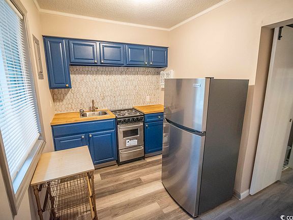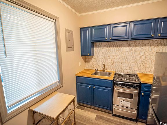 Great investment property or perfect beach life getaway!! Has great potential for long term rental income. Quiet community with swimming pool and view of golf course. This efficiency has been updated last year with laminate flooring throughout, tile in the bathroom, butcher block counter in kitchen and new fixtures, balcony, drywall, paint, new bath fixtures, new refrigerator, ventless washer/dryer, crown molding, and hot water heater. Short drive to beaches, shopping, restaurants and hospital.