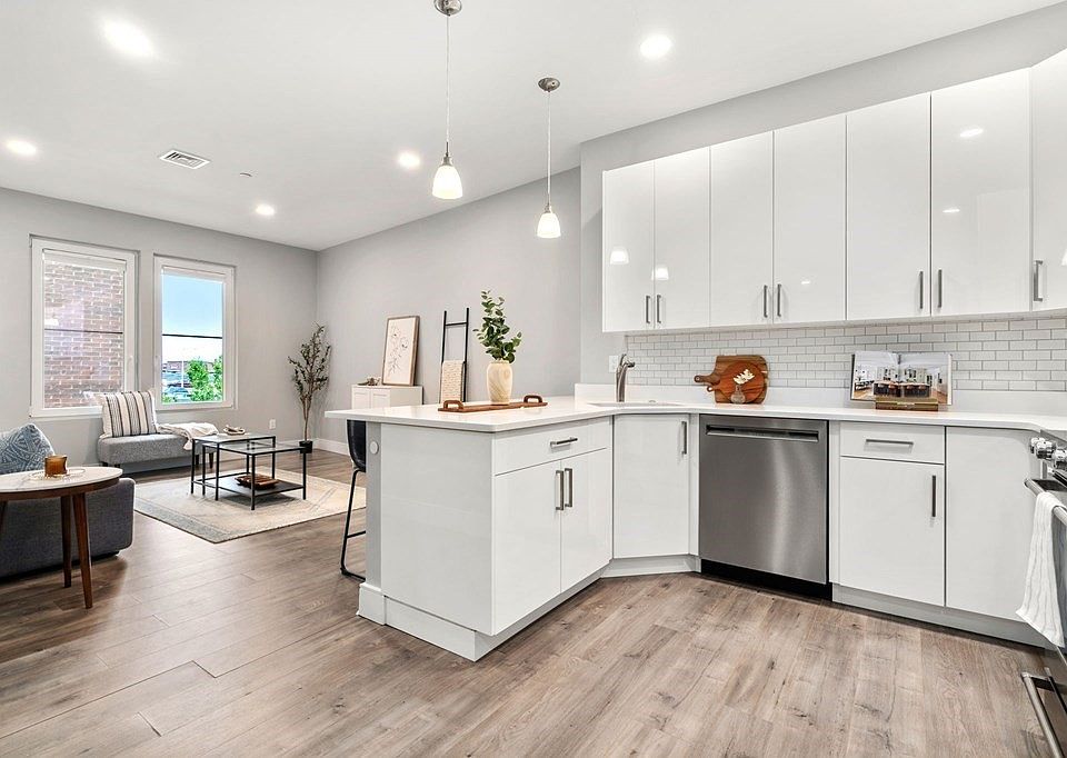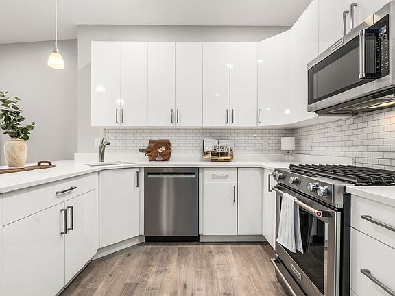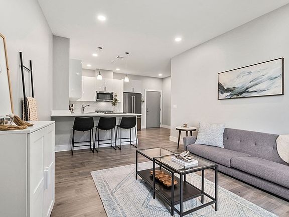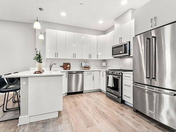 Located in the heart of Charlestown’s Sullivan Square, 610 Rutherford, completed in 2020, is a boutique style building with modern amenities. This two bedroom, one bathroom features an open floor plan with double grey wide plank flooring throughout, 9' ceilings and oversized high efficiency European windows. The modern chef’s kitchen has expansive quartz countertops with peninsula bar seating, KitchenAide appliances including gas range, disposal and lots of great kitchen storage. Both bedrooms, generously sized, are complete with double wide closets and two windows. A spacious full bathroom with porcelain tiled floors, quartz vanity and glass enclosed, subway tiled shower. In unit washer & dryer, central AC, lots of great common space featuring a roof deck with adjoining club room, landscaped patio with grill and dog run. Adjacent to Assembly Row's fantastic restaurants, Encore, 93 and a 10 min T ride into downtown Boston via Sullivan Sq. Rental parking is available for $175 per month.