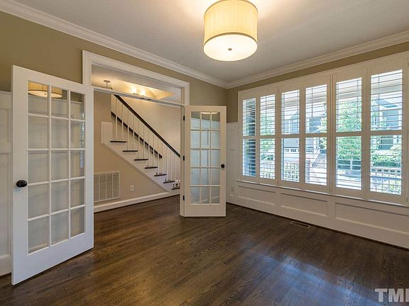 Zinn Designed with all the fabulous finishes from top to bottom! Freshly painted with a versatile floor plan that includes a gourmet kitchen, beautifully tiled bathrooms, plantation shutters, hardwood floors, a main level guest suite, and a finished third floor. And the lot....wonderful! Flat, fenced and private, it's adjacent to wooded open space! Stroll to the neighborhood pool and playground and there is easy access to the Claremont Greenway and Bolin Creek!