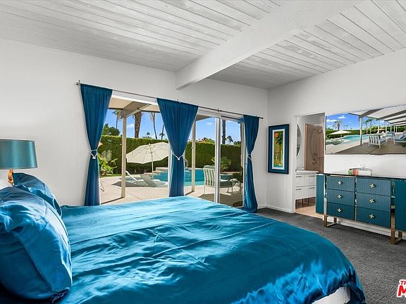Available furnished beginning May 2026, this iconic mid-century Alexander residence in Palm Springs' coveted Little Beverly Hills offers an elevated, resort-level living experience for extended stays. Designed by Palmer & Krisel and thoughtfully refreshed, the home blends iconic architecture with modern comfort: soaring post-and-beam ceilings, walls of glass framing mountain views, and a bright open layout ideal for relaxed long-term living. The updated kitchen features distinctive turquoise cabinetry and stainless appliances, flowing into a spacious living and dining area curated with designer furnishings. The primary suite opens directly to the backyard, while two additional bedrooms provide flexibility for guests or remote work. Outside, the property lives like a private boutique resort with a heated pool, spa, sun shelf, fire feature, multiple lounging and dining zones, and a fully covered patio for year-round enjoyment. Set in a quiet neighborhood close to golf, shopping, and downtown Palm Springs, this turnkey home is perfect for those seeking a sophisticated desert retreat for a 3-6 month (or longer) stay.