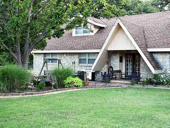This beautiful stone home sits on approx. 2 beautiful acres. It has 2 large living areas. A wonderful stone fireplace and the same natural stone backsplash in updated kitchen on opens to living area w/fireplace! Many updates including all 3 bathrooms and new doors throughout. There are 3 bedrooms and 2 bathrooms downstairs and additional 2 bedrooms and bathroom upstairs! There is also a study upstairs. The large covered patio stretches across the back of the home. Also 30 x 60 shop & lg. storage building.