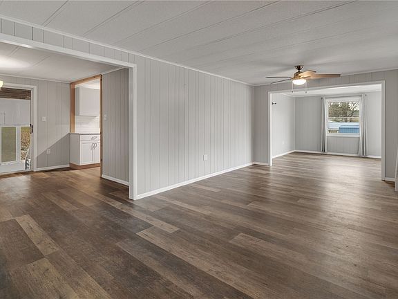 Some of the extensive renovations include completely new paint inside and out, new luxury vinyl flooring throughout, new stained wood siding on the three-season room, a new three-bay window in the living room, new cabinets, knobs, and pulls, quartz countertops,new appliances (except refrigerator), new lighting fixtures kitchen and bath, updated PEX plumbing in the kitchen and bath, new vanity, top, mirror, and hardware in both baths, seamless gutters and snow/ice guards, new sheetrock, insulation, and floor paint in the 3-season room, new metal roof, side door, and fresh paint on the garage.