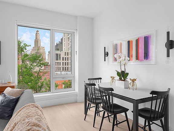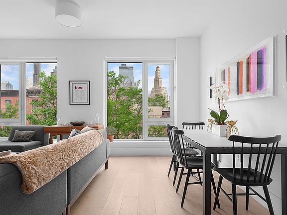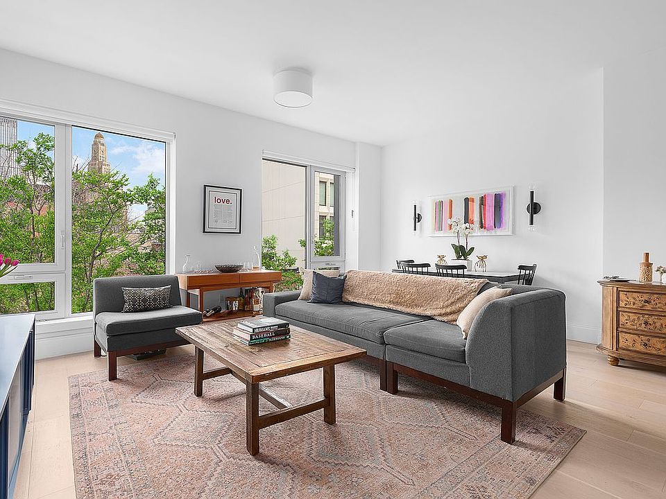 OPEN HOUSES BY APPOINTMENT ONLY! A sunny and beautifully finished two-bedroom, two-bathroom condominium with stunning views, layering the verdant tranquility of trees against the vibrant Downtown Brooklyn skyline, complemented by a PRIVATE PARKING SPACE and storage unit. Step through the welcoming entry foyer, past the ample coat closet, into an open-plan living and dining area. The space, graced with luxurious wide-plank white oak floors, integrates a kitchen and living/dining area designed for comfort and style. Crafted by the renowned Paris Forino, the kitchen melds functionality with aesthetic grace. Brazilian Arabescato-honed countertops meet ceramic white tile backsplashes in a display of understated elegance. The kitchen is equipped with a suite of stainless steel Gaggenau appliances, including a cooktop, oven, and microwave drawer, alongside a paneled Bosch dishwasher, ensuring that both entertaining and everyday cooking are executed with ease. A built-in cutting board and an in-island blackened-steel storage niche underscore the meticulous attention to design detail throughout the home. Journey down the hallway to find two spacious bedrooms. The primary bedroom features a walk-in closet and an ensuite bath featuring a serene palette of Sivec marble and custom teak flooring in the walk-in shower, alongside a bespoke white oak vanity. With its dramatic striped marble mosaic tiling and a luxurious soaking tub, the guest bathroom is complemented by chrome Waterworks fixtures. Modern conveniences such as central heating and AC, California Closets, and an in-home washer/dryer elevate everyday living. Your own parking spot in the self-park garage and a deeded storage cage enhance this already exceptional offering. 610 Warren Street presents a boutique condominium experience with just 31 residences, offering amenities that cater to every aspect of modern city living. From the part-time doorman and virtual assistance to the fitness room, children's playroom, entertainment lounge, and a common roof deck, residents enjoy unparalleled convenience and luxury. Positioned amidst the tranquil townhouse blocks of Boerum Hill and Park Slope, with its array of charming restaurants and shops, this address promises an oasis of calm just steps from the heart of the city. The proximity to Prospect Park and the Atlantic Barclays Subway Terminal places the best of New York within easy reach, making 610 Warren not just a residence, but a lifestyle. A 15-year tax abatement is in effect until 2034.