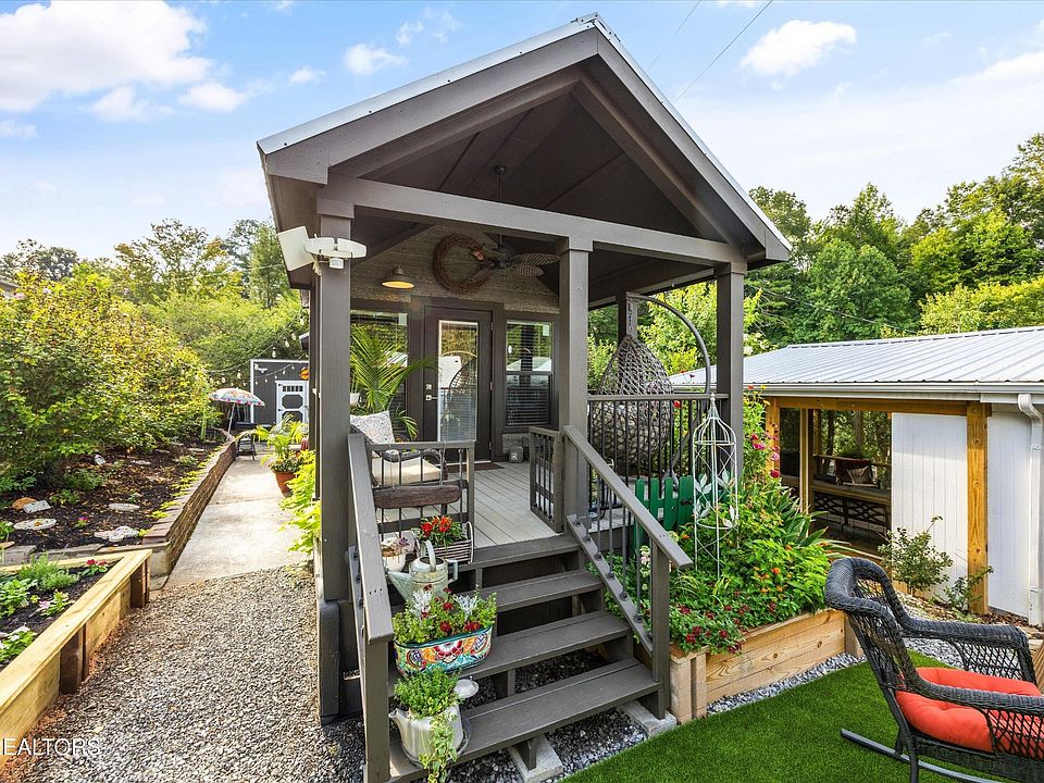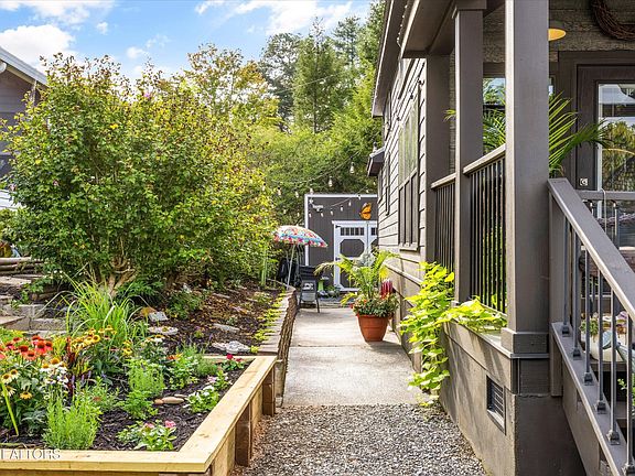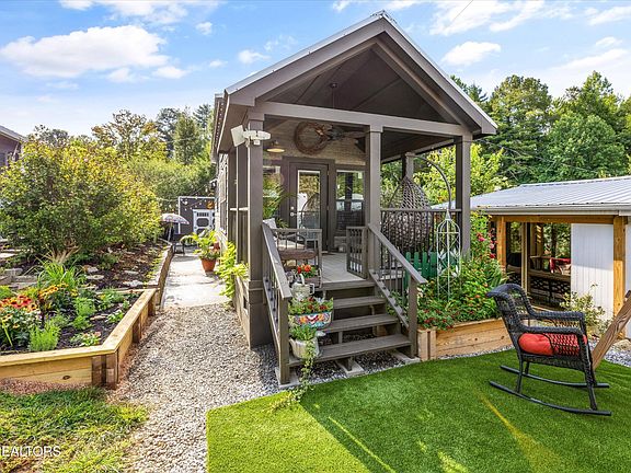 Step outside and you'll find a 10' x 12' storage building with electricity, also secured with metal strapping and augers, along with extensive landscaping that the seller has beautifully put in place. The inviting front porch is perfect for relaxing under the ceiling fan while neighbors cruise by on golf carts headed to the community pools, golf courses, tennis courts, or the pond, you might even catch a bear sighting!