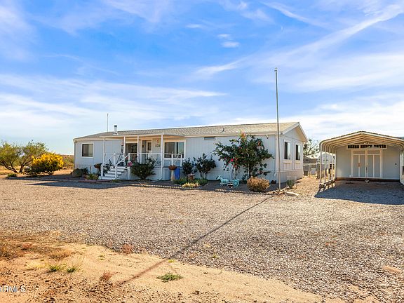 UPDATE: Brand-new roof just installed and fresh carpet coming soon to two bedrooms!! Discover peaceful desert living on this fully fenced 4.35-acre property in Hereford. The charming 3-bedroom, 2-bath manufactured home offers a split floor plan, vaulted ceilings, & bright, open layout. The kitchen features ample counter space, updated appliances. The spacious primary suite includes a large wall-length closet & full bath with double sinks. The bath has a spacious walk-in shower. The bathroom also features heated flooring. Enjoy breathtaking mountain views while lounging in the pool; mature mesquites, fruit trees (apple, peach, pear, pecan & fig), & room for horses, RVs, or future outbuildings. A covered rear patio & large front porch plus detached shed add to the home's functionality. A heat pump will keep you comfortable plus there's a wood stove fireplace.