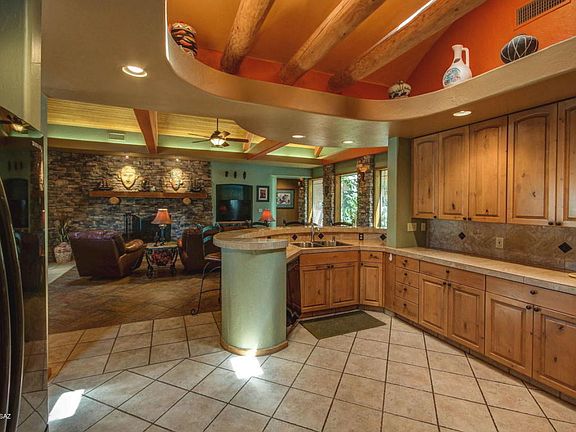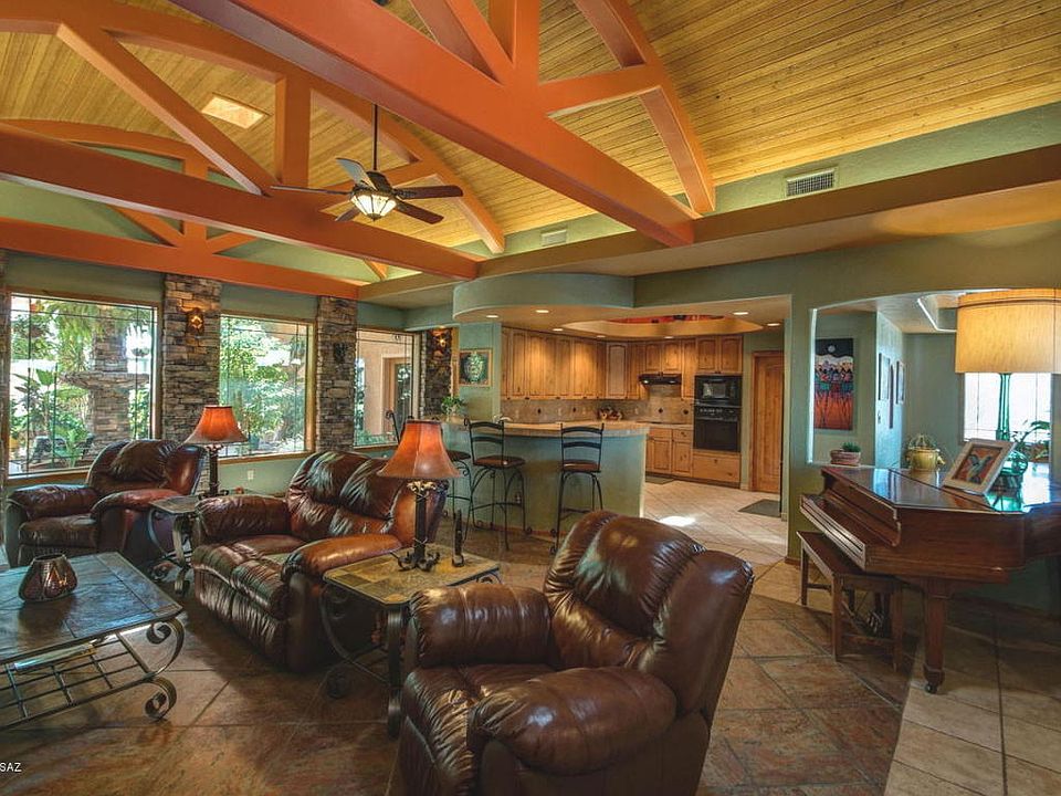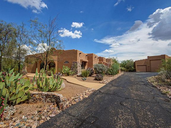 True luxury living in this custom private retreat with over 3100sf! Rare opportunity to own the Builder's personal home...built to perfection & filled with special features including a stunning Atrium with custom water feature, skylights thru-out, tile flooring, recessed & designer lighting, gourmet kitchen w/tile counters/backsplash, Alder cabs & unique curved b-fast bar, all appliances, stacked stone accents inside & out, cozy f/p in family room & m-suite, m-bath w/luxurious soaking tub, split bdrs, 3 bthrms, exposed beam ceilings, landscaped bkyd w/mature trees, shrubs & hot tub, 2 car attached g/r & 2 car detached garage featuring it's own office space w/wall A/C, loft & R/V bay with full hook ups, 2 septic's, situated on almost 3.5 ac of saguaro studded property w/stunning Mtn views!
