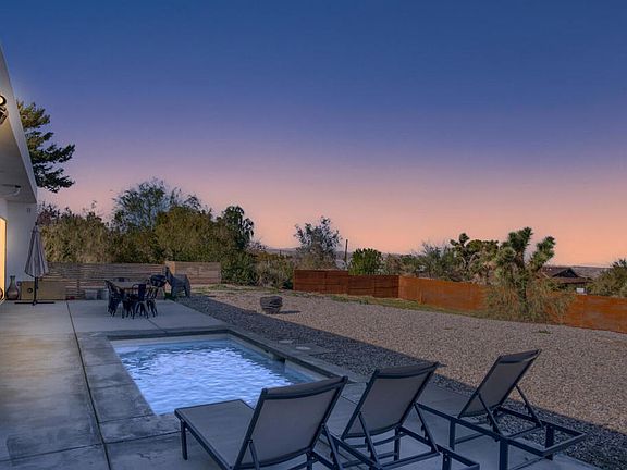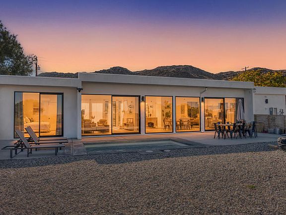 Modern 2021-built home with floor-to-ceiling German-imported Arka windows, paid-off premium solar, and stunning mountain & desert views from every room. This contemporary retreat blends high-end design with exceptional comfort, offering a bright, open layout and top-tier finishes throughout. Perfect as a full-time residence, desert getaway, or turnkey short-term rental--with the option to assume the existing successful Airbnb listing and furnishings (additional price). Inside, enjoy a beautiful modern kitchen featuring quartz countertops, tiled backsplash, sleek cabinetry with soft-close drawers, open shelving, and a large wine fridge. The spacious living area includes an electric fireplace/heater, built-in Sonos ceiling speakers, dimmable lighting, and seamless indoor-outdoor flow. All four bedrooms are generously sized, and three feature en suite bathrooms, ideal for privacy and guest comfort. Barn doors on closets, keyless entry, and a tankless water heater add both style and convenience. Go outside to the expansive nearly 1/2-acre lot with a 15' x 8' propane-heated 4-ft deep pool (dedicated propane tank & autofill), large concrete patio with grill, and wide-open desert skies. Additional highlights include a 2-car carport, large finished storage room, an EV charging port (NEMA 14-30 & 14-50 capacity), very efficient 6 mini split/3 condenser heating and AC system, low-voltage speaker wiring, virtually no electric bills, WiFi connection, and new washer/dryer. Located just 10 minutes to Joshua Tree National Park, 5 minutes to Downtown Joshua Tree, and a 3-minute walk to the Friendly Hills hiking trail, home to occasional Mojave Tortoise sightings. With high-end construction and a proven rental history this property is an exceptional opportunity in one of the desert's most desirable locations.