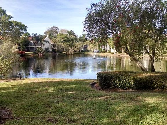 Remodeled first floor, end unit in the lovely residential community of Vizcaya. Great eat-in kitchen with new wood cabinets, granite counters, stainless steel appliances and window looks out to courtyard entrance with fountain. Living room and dining room both with sliders to the 23' screened lanai that give unimpeded views of lake and fountain. Master bedroom with 2 walk-in closets, and large master bath with whirlpool tub, tiled shower and sliders to gated privacy garden. Guest bedroom/den off living room with full bath and doors to garden. Watch the sunset over the lake from the 23 lanai which spans the dining/living/master bedroom affording all room spectacular water views.