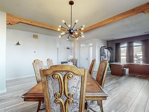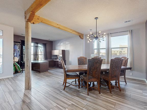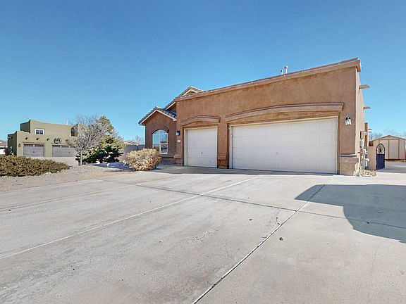 This stunning Centex Custom home features abundant space with Southwest charm in these 3,872 sq./ft. This 6 bedroom, 3 bath dream home will satiate any of your housing needs. This home sits on a large corner lot with multiple spaces for outdoor fun, as well as a huge shed. Inside, you are greeted by plenty of natural light, tall ceilings, a kiva fire place, and space galore. The bonus room upstairs boasts a view that will take your breath away with scenes of the Sandia Mountains and skies for miles. The open floor plan, endless storage with a 3 car garage, updated kitchen, plus RV parking and no HOA, all make this home perfect for entertaining, growing up in, and experiencing all that NM has to offer.