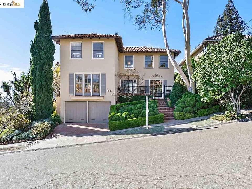 Elegant traditional offers it all: beautiful architecture, fabulous floor plan, spacious rooms, large landscaped yard, Bay/Bridge & Mt Tam views, just blocks from College Ave shops, restaurants, BART & top rated Chabot elementary. Main level has light filled living room w/ fireplace, formal dining room, oak floors. Eat in kitchen w/ new stainless appliances, including 6 burner gas range. A home office/library doubles as 4th bedroom w/ full bath. Second level has 3 ample size bedrooms & 2 full baths w/ master suite leading to a sunny view deck. Bonus finished basement space w/ easy access to the yard for entertaining. Interior access garage. Prestigious hood with underground utilities.