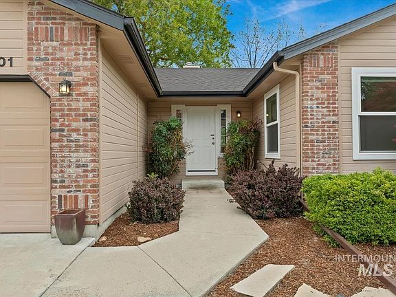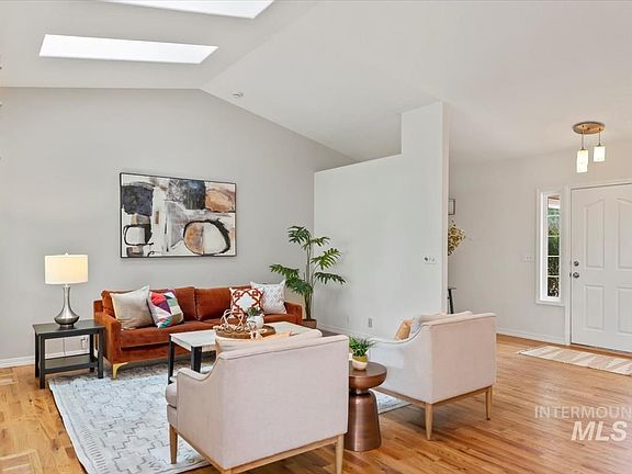 This beautifully updated single-level home is nestled in a charming, friendly neighborhood just one block from greenbelt access and the Boise river. Featuring mature landscaping, dual patios, and a private green space behind the house instead of rear neighbors, this home offers both privacy and community in an ideal location - just minutes from schools, shopping, and dining. Inside, enjoy hardwood floors, vaulted ceilings, and skylights that flood the home with natural light. The updated kitchen boasts stainless steel appliances, quartz countertops, and gas range. The primary bedroom feels spacious and offers an ensuite with dual vanities and a tiled walk-in shower. Additional highlights include: vinyl windows, garden boxes, storage shed, thoughtfully designed landscaping, and attached 3 car garage. This home blends modern comfort with natural beauty, perfect for relaxing, entertaining, and everyday living. No flood insurance required!